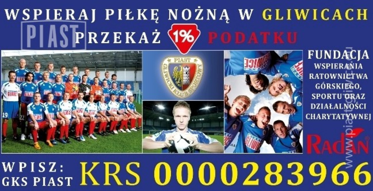 Aby przekazać 1% na rzecz grup młodzieżowych Piasta Gliwice należy w deklaracji podatkowej wpisać KRS 0000283966 z dopiskiem „Piłka nożna”.