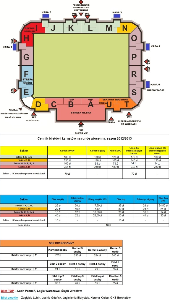 Sprzedaż karnetów na rundę wiosenną sezonu 2012/13 T-Mobile Ekstraklasy oraz wyrabianie kart kibica rozpocznie się 4 lutego i będzie podzielona na dwie fazy. Od 4 lutego do 9 lutego sprzedaż będzie prowadzona dla osób posiadających karnety w rundzie jesiennej sezonu 2012/2013 (wyłącznie w kasach). Od 11 lutego każdy kibic będzie mógł kupić karnet (również on-line). W dalszej części przedstawiamy cennik, oraz harmonogram sprzedaży karnetów i biletów. Prosimy o dokładne zapoznanie się z zawartymi informacjami.
