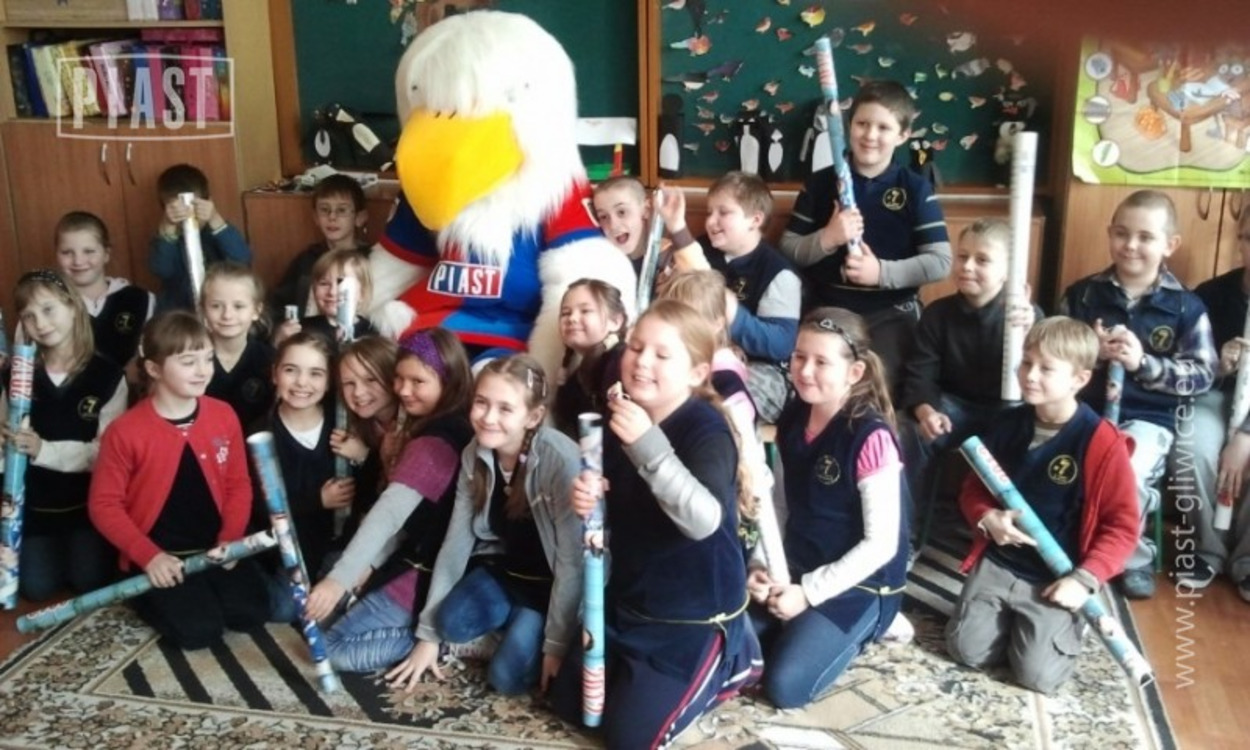 Wizyta Orzełka przebiegała w podobnej formule jak w trakcie ostatnich odwiedzin innych glwickich placówek edukacyjnych. Trzeba jednak przyznać, że uczniowie z klas drugich i trzecich długo nie wypuszczali maskotki, zadając jej masę pytań, często pozytywnie zaskakując naszego sympatycznego ptaszka znajomością tematyki futbolu i Piasta Gliwice. Nawet nauczycielki brały czynny udział w prowadzonej konwersacji. Orzełek także przeprowadził małą próbę dopingu, włączając do śpiewu nawet najbardziej opornych. Opuszczając szkołę, obiecaliśmy, że następnym razem towarzyć będą nam piłkarze "Piastunek".