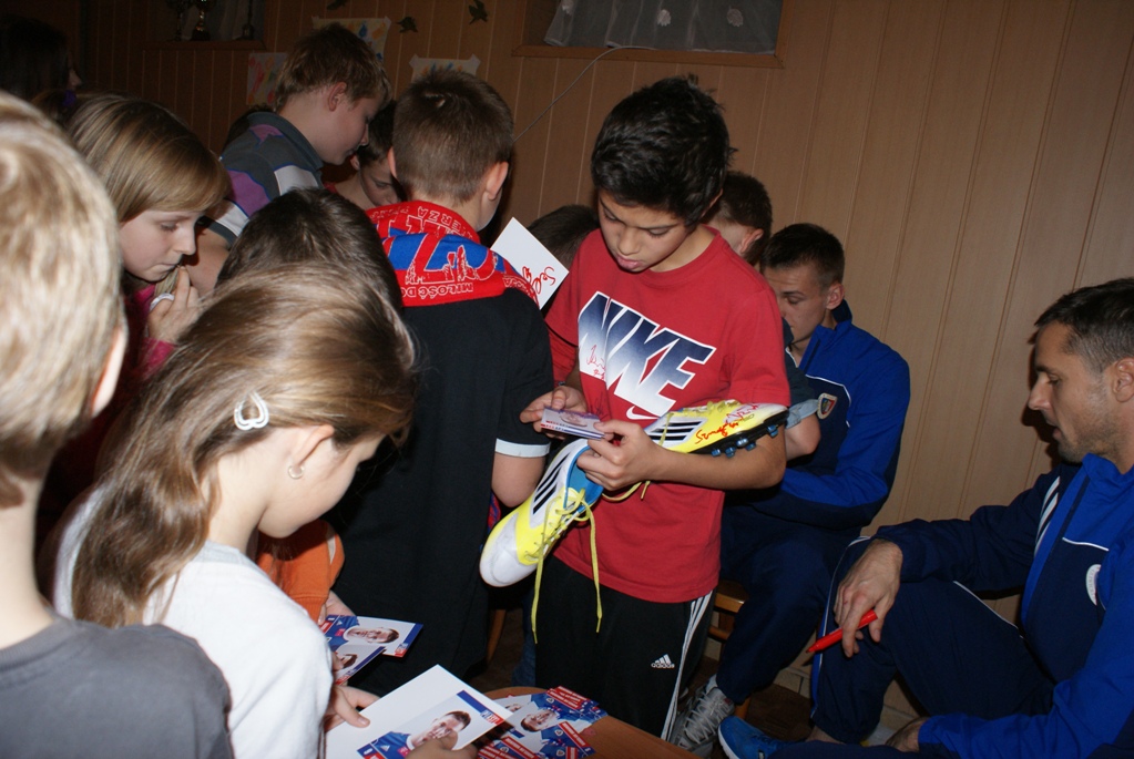Jakub Szmatuła podzielił się z najmłodszymi piłkarską drogą, którą przebył nim trafił do Gliwic, po czym dzieci opowiedziały o swoich kontaktach z futbolem. Wiele emocji wywołało rozdawanie autografów i wspólne zdjęcia. Piłkarze podpisywali się nie tylko na specjalnych kartach, ale koszulkach, rękach, getrach czy korkach. Na zakończenie wizyty obie strony przekazały sobie upominki i wszyscy udali się na zewnątrz na kilkunastominutową zabawę z piłką.