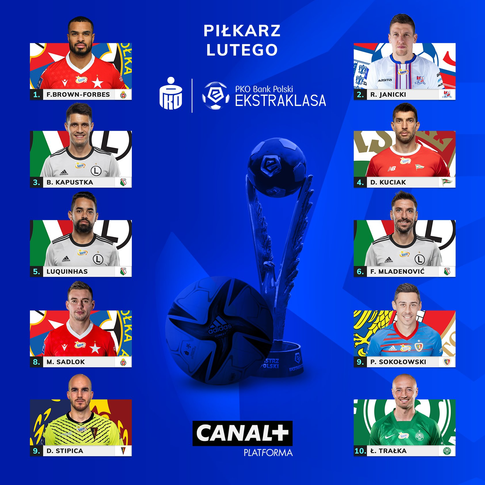 Patryk Sokołowski jest jedynym przedstawicielem Piasta w plebiscycie na piłkarza lutego i ma szansę przedłużyć serię nagradzanego w poprzednich miesiącach Jakuba Świerczoka. Poza pomocnikiem Niebiesko-Czerwonymi nominowani do tytułu piłkarza miesiąca są: Filip Mladenović, Bartosz Kapustka, Luquinhas (wszyscy Legia), Felicio Brown-Forbes, Maciej Sadlok (obaj Wisła K.), Rafał Janicki (Podbeskidzie), Łukasz Trałka (Warta) Dante Stipica (Pogoń), a także Dusan Kuciak (Lechia).