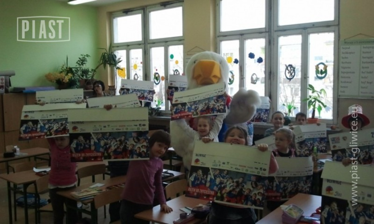 Maskotka Piasta Gliwice kontynuuje podróż po gliwickich placówkach oświaty. Tym razem odwiedziła Szkołę Podstawową nr 27. Orzełek nie był jedyną jednak atrakcją poniedziałkowej wizyty. Zajęcia sportowe na szkolnej sali poprowadził zawodnik niebiesko-czerwonych, Patryk Nalepa. Zobacz zdjęcia.