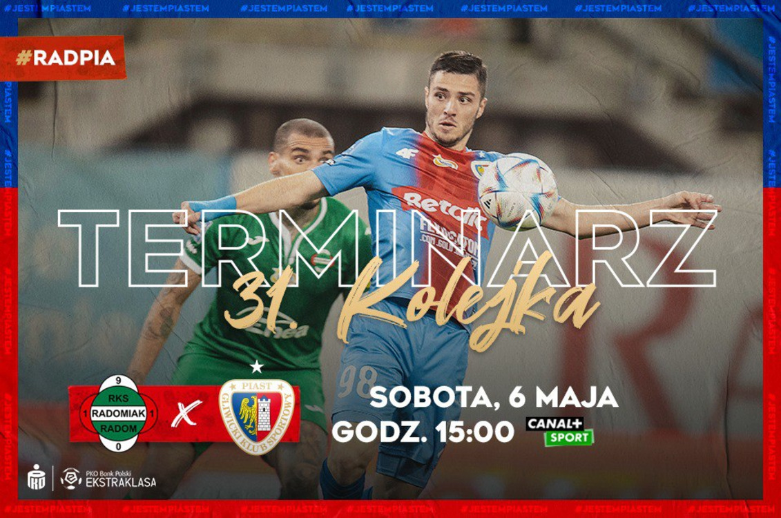 Poznaliśmy szczegółowy terminarz 31. kolejki PKO Bank Polski Ekstraklasy, w której Piast Gliwice zmierzy się na wyjeździe z Radomiakiem Radom. Przedostatnie spotkanie w delegacji Niebiesko-Czerwoni rozegrają w sobotę, 6 maja o 15:00.