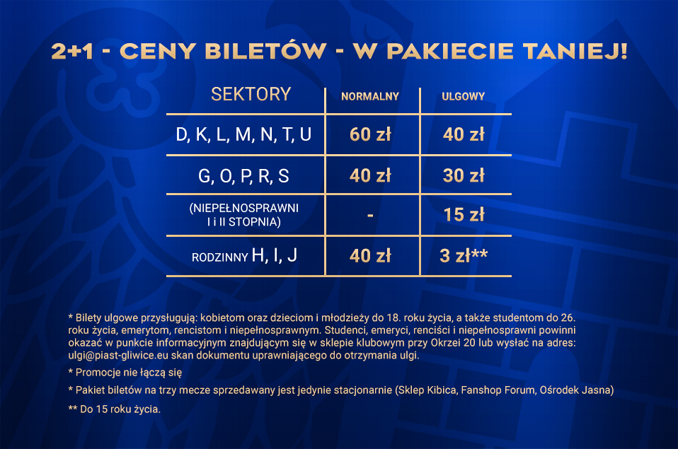 Piast Gliwice pragnie zaproponować swoim kibicom korzystną ofertę na jesienny "trójmecz". Kibic już teraz może zakupić pakiet wejściówek na mecze domowe, jakie będą do rozegrania do końca roku kalendarzowego. Dzięki temu zaoszczędzi nie tylko czas, ale i pieniądze.