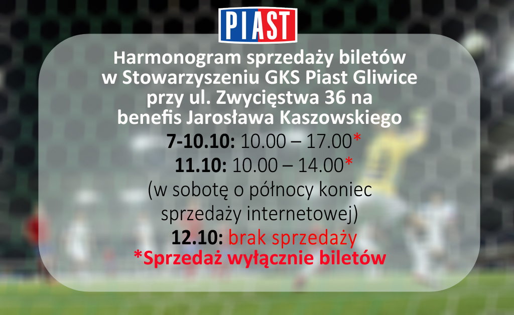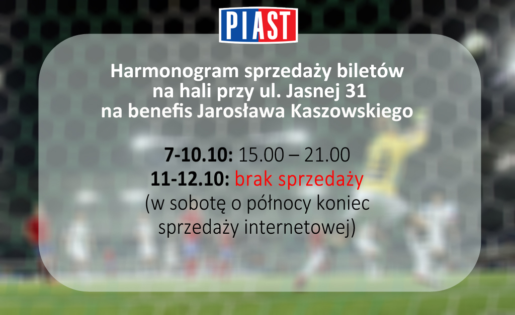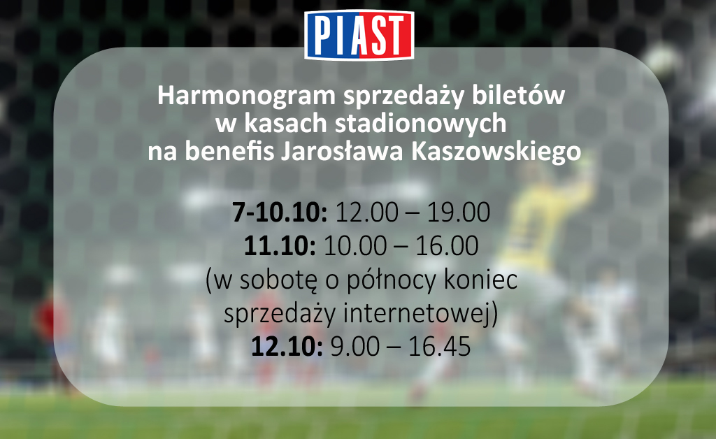Informujemy, że bilety na benefis Jarosława Kaszowskiego będą dostępne w sprzedaży od wtorku 7 października. Każdy kto nabędzie bilet w cenie 8 zł otrzyma w kasach pamiątkowy bilet wraz z koszulką. Osoby kupujące bilety w internecie będą mogły odebrać pamiątki w budynku klubowym na stadionie. UWAGA! Ilość koszulek jest ograniczona! Szczegółowy harmonogram sprzedaży znajduje się poniżej.