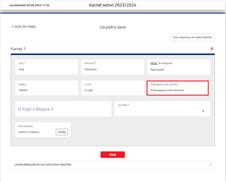3. Numer karnetu osoby polecającej należy wpisać podczas zakupu karnetu w polu "Polecający- numer karnetu" albo podać kasjerowi przy stacjonarnym zakupie w sklepie kibica przy Okrzei 20 lub salonie 4F w Forum.