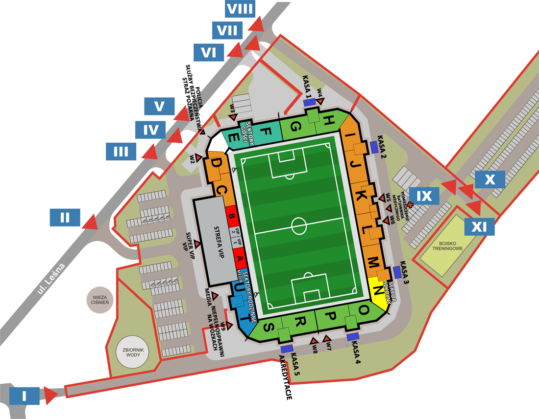 - Jeżeli masz zakupiony bilet lub karnet na sektory G, H - idź ulicą Leśną i wejdź przez bramę nr VII.