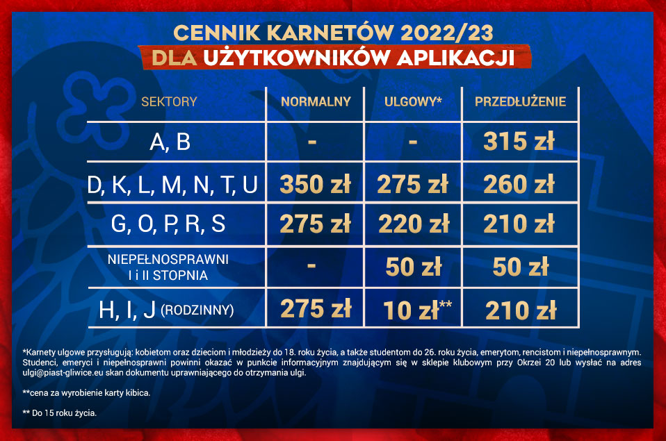 * Karnety ulgowe przysługują: kobietom oraz dzieciom i młodzieży do 18. roku życia, a także studentom do 26. roku życia, emerytom, rencistom i niepełnosprawnym. Studenci, emeryci, renciści i niepełnosprawni powinni okazać w punkcie sprzedaży lub wysłać na adres: ulgi@piast-gliwice.eu skan dokumentu uprawniającego do otrzymania ulgi. Dzieci do 13. roku życia mają wstęp wolny.