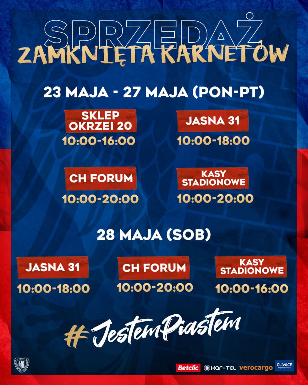 Kup karnet, nie przegap żadnego z meczów i kibicuj Niebiesko-Czerwonym w kolejnym sezonie PKO Bank Polski Ekstraklasy! Zamknięta sprzedaż karnetów ruszy już 23 maja o godzinie 10:00! Powiedz #JestemPiastem i bądź z Piastem! #CŻPG