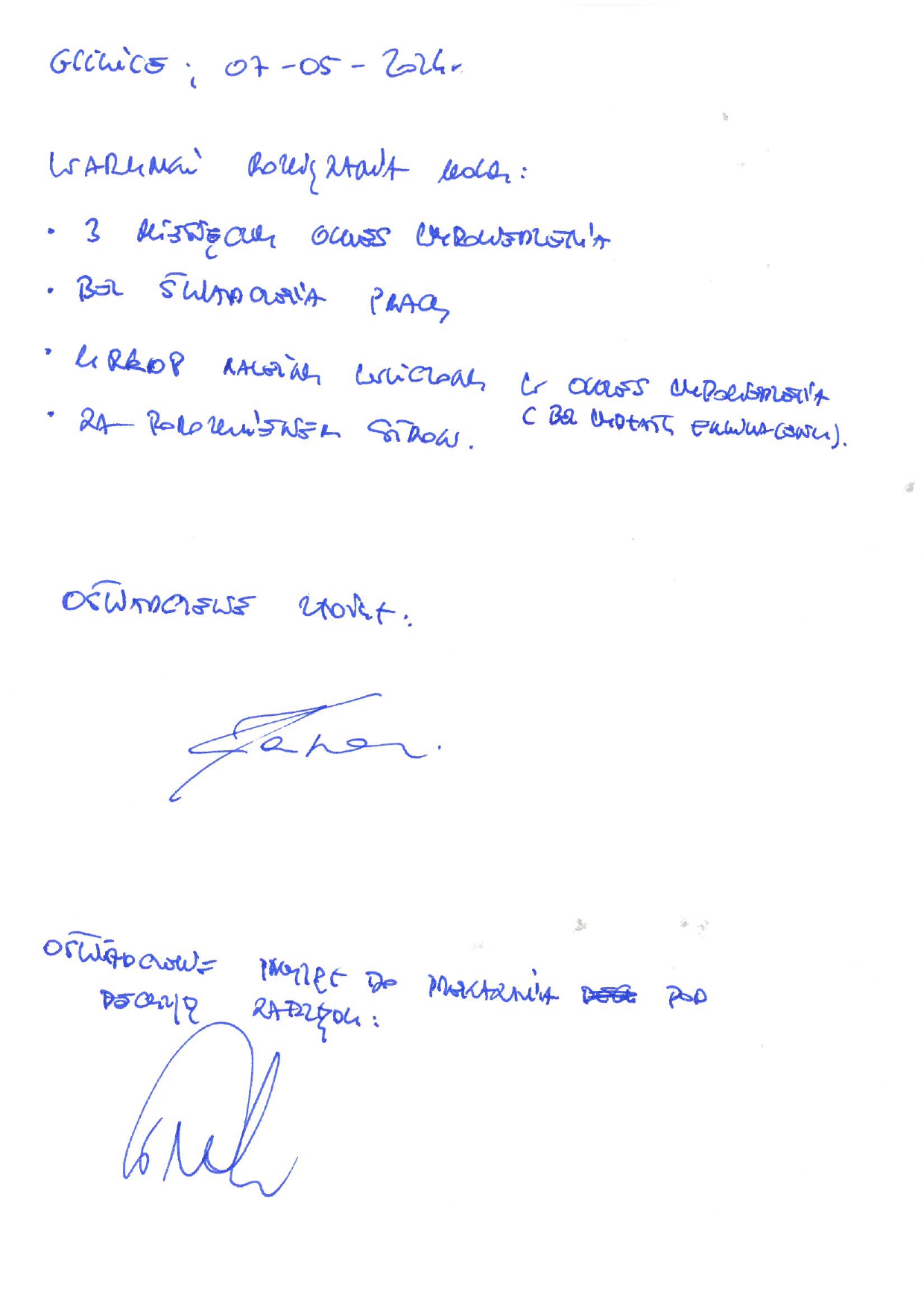 - W dniu 7 maja Pan Jarosław Kaszowski pojawił się w Spółce i od razu złożył wniosek o rozwiązanie umowy za porozumieniem stron z zachowaniem trzymiesięcznego okresu wypowiedzenia bez obowiązku świadczenia pracy, co naraziłoby klub na poniesienie wysokich kosztów. Warto zaznaczyć, że Pan Jarosław Kaszowski był nieobecny w klubie 4 lata, a w momencie przywrócenia go do pracy od razu wyraził wolę rozwiązania umowy o pracę. Pan Jarosław Kaszowski już pierwszego dnia wskazał, że nie chce pracować w Spółce i chciał rozwiązać stosunek pracy (zał. 1).