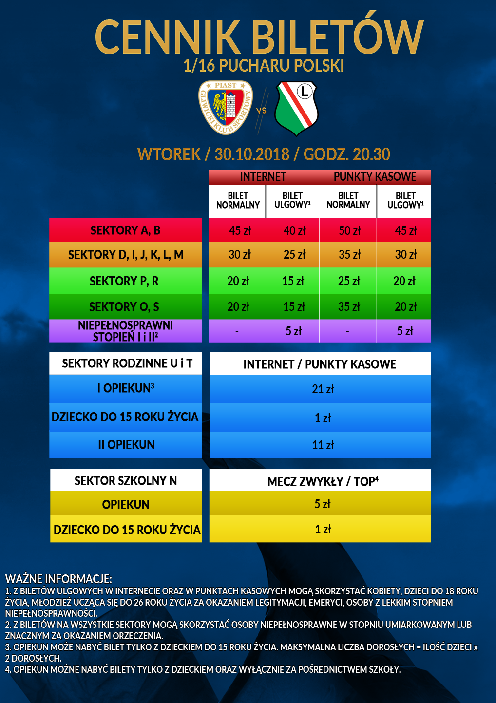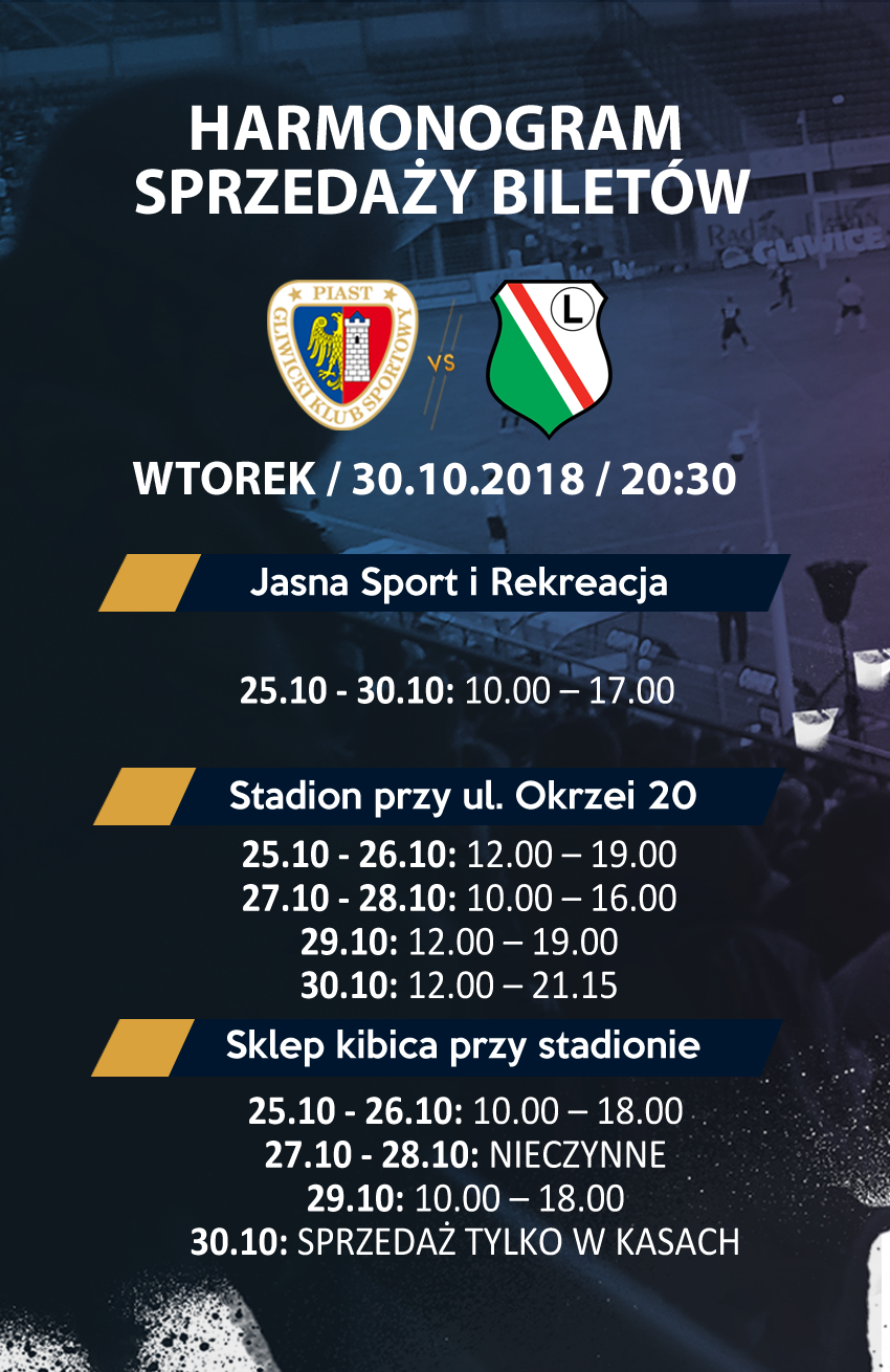 Prezentujemy cennik oraz harmonogram sprzedaży na mecz 1/16 Pucharu Polski, w którym podejmować będziemy Legię Warszawa. Sprzedaż rozpocznie się w czwartek 25 października w punktach kasowych, w aplikacjach internetowych bilety.piast-gliwice.eu, kupbilet.pl, we wszystkich salonach Empik oraz w wybranych punktach sieci Kolporter.