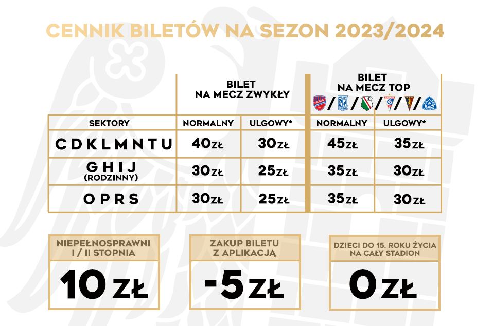 * Bilety ulgowe przysługują: kobietom oraz dzieciom i młodzieży do 18. roku życia, a także studentom do 26. roku życia, emerytom, rencistom i niepełnosprawnym III stopnia. Studenci, emeryci, renciści i niepełnosprawni powinni okazać w punkcie sprzedaży lub wysłać na adres: bilety@piast-gliwice.eu skan dokumentu uprawniającego do otrzymania ulgi. Dzieci do 15. roku życia mają wstęp wolny.