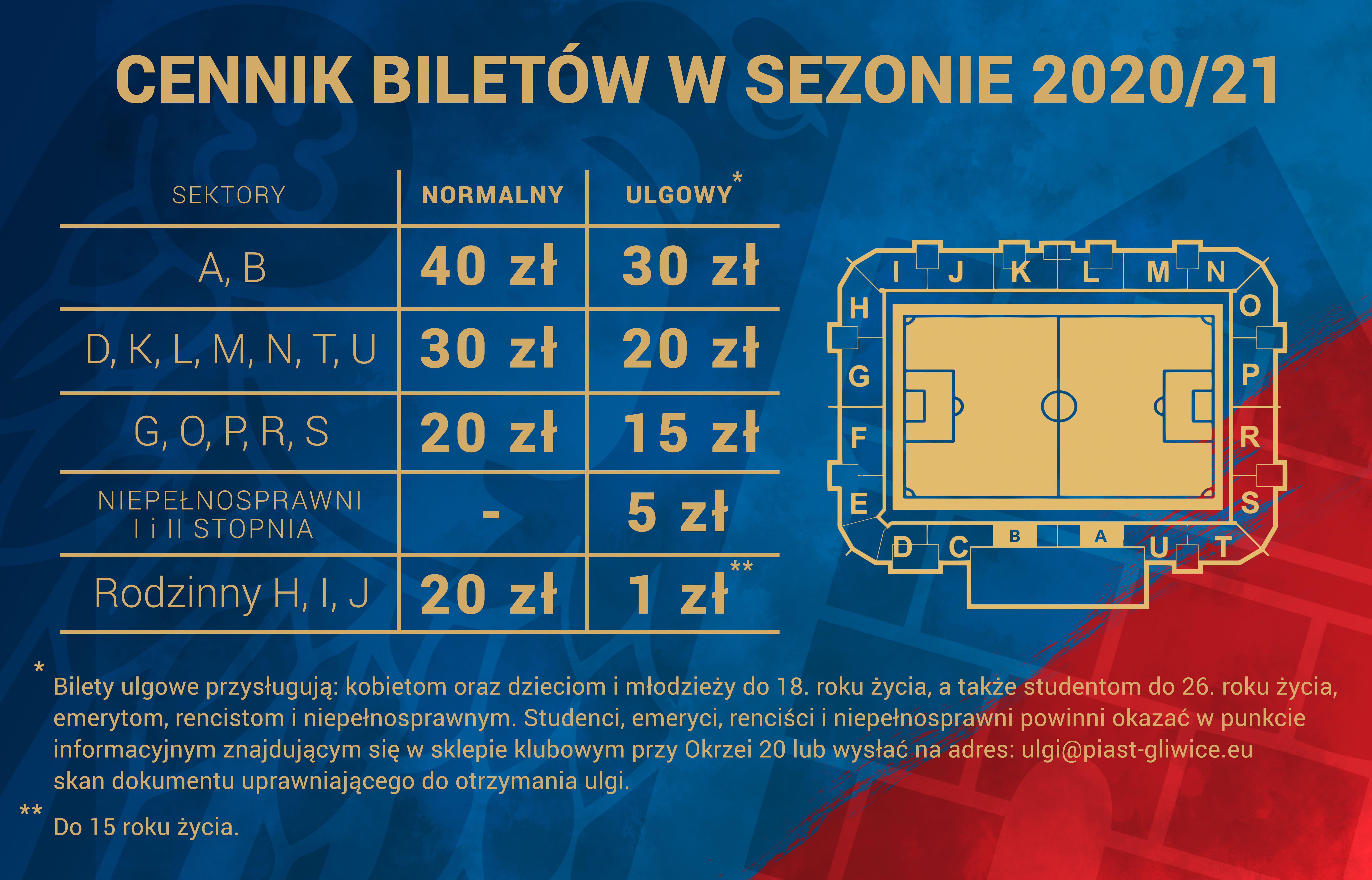 W ofercie znajdują się dwa rodzaje biletów - normalne oraz ulgowe. Bilety ulgowe przysługują: kobietom oraz dzieciom i młodzieży do 18 lat, a także studentom do 26 lat, emerytom, rencistom i niepełnosprawnym. Studenci, emeryci, renciści i niepełnosprawni powinni okazać w punkcie informacyjnym znajdującym się w sklepie klubowym przy Okrzei 20 lub wysłać skan dokumentu uprawniającego do otrzymania ulgi na adres: ulgi@piast-gliwice.eu.