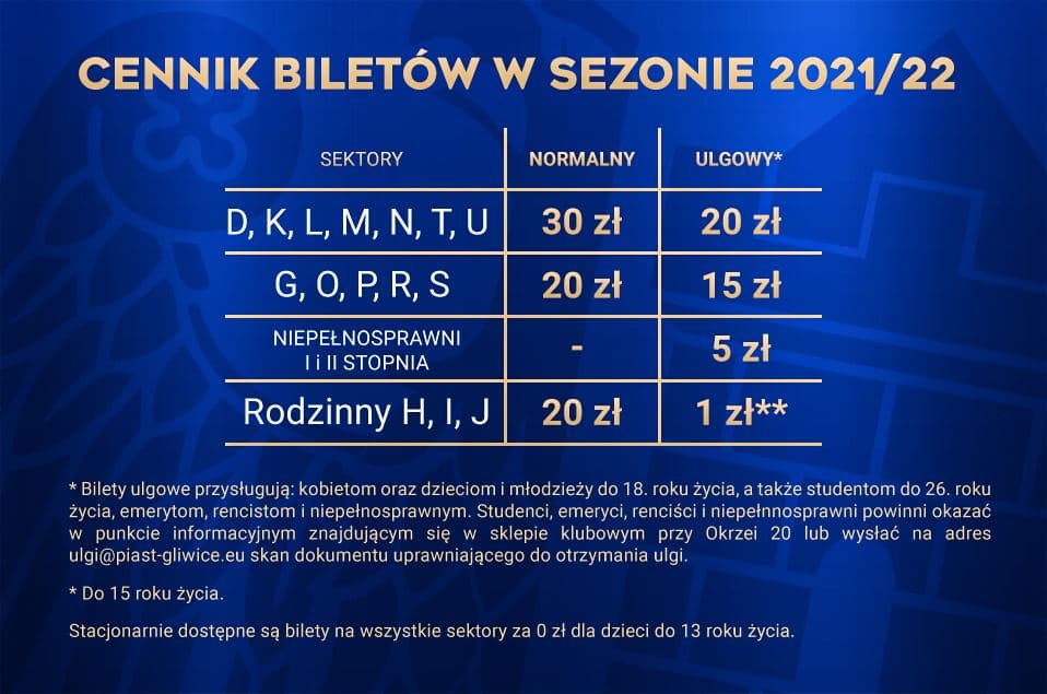 Bilety można zakupić poprzez stronę bilety.piast-gliwice.eu, a także w Oficjalnym Sklepie Piasta Gliwice, w stadionowych kasach oraz ośrodku Jasna31.