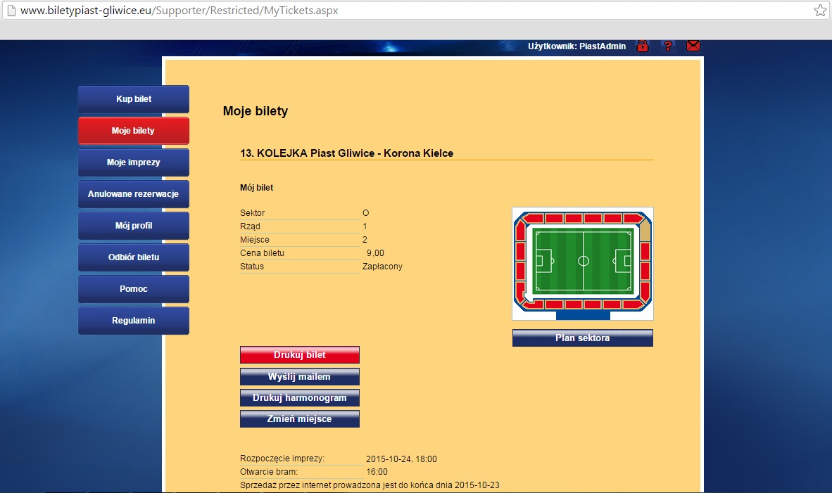 4. Po wyborze ilości biletów, sektora, rzędu oraz miejsca dokonaj płatności za wejściówkę.