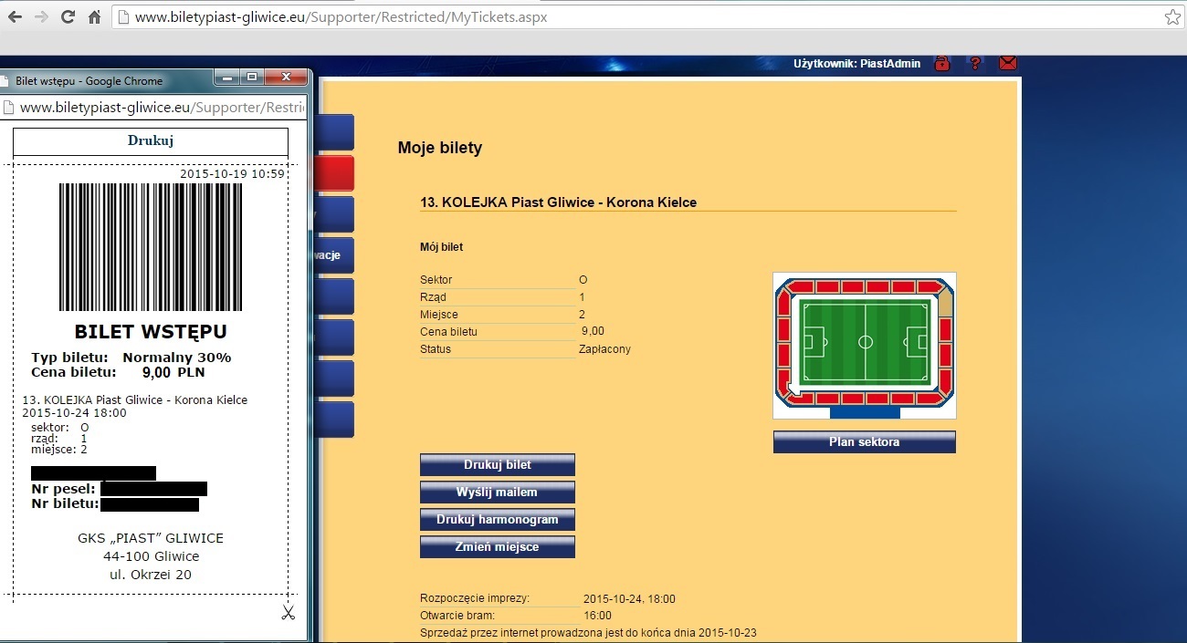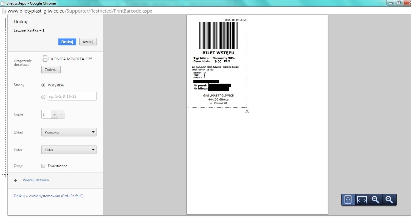 6. Po kliknięciu w "Drukuj bilet" pojawi się nowe okno, w którym należy wydrukować wejściówkę.