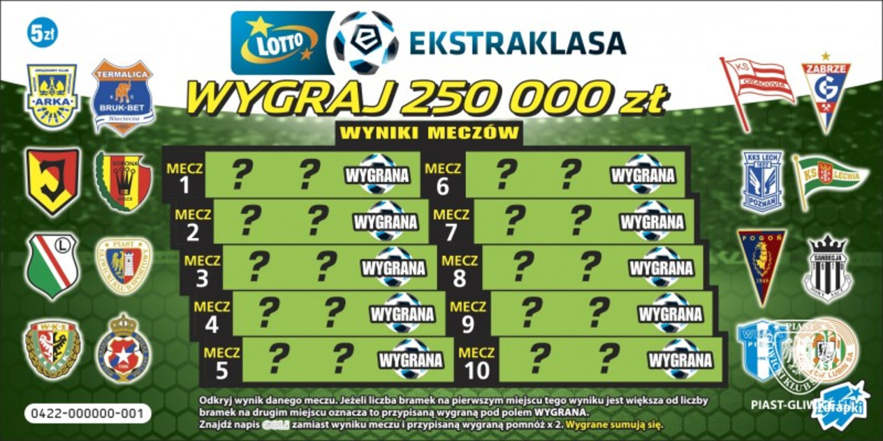 Cena jednej zdrapki to pięć złotych. LOTTO Ekstraklasa oferuje wygrane od 5 złotych do 250 tysięcy złotych. Na szczęśliwców czekają aż trzy główne wygrane.