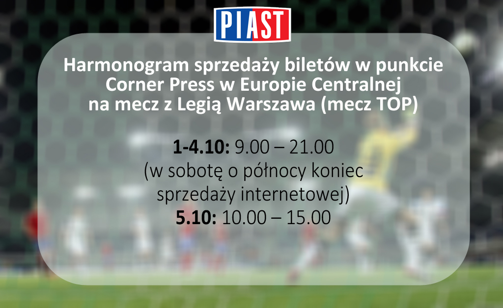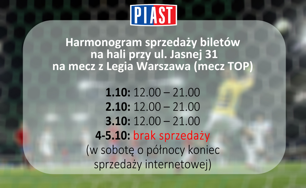 5 października, o godz. 15.30, na Stadionie Miejskim w Gliwicach staną naprzeciw siebie jedenastki Piasta i Legii. Niebiesko-czerwoni powalczą o pierwsze w historii zwycięstwo nad stołeczną drużyną i będą potrzebować Waszego wsparcia! Zobaczcie jak wygląda harmonogram sprzedaży wejściówek.
