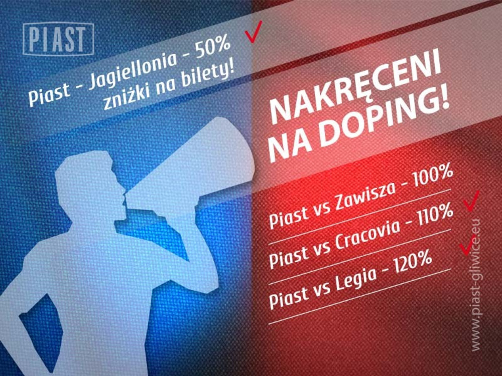 Głośne chóralne śpiewy i wspólna zabawa na trybunach sprowadzają się do jednego celu - maksymalnego wsparcia ukochanej jedenastki walczącej o ligowe punkty. Niejednokrotnie Wasza obecność uskrzydlała Niebiesko-czerwonych, a Nasze Okrzei tętniło życiem. Dajcie z siebie wszystko na meczach z Cracovią i Legią, a na spotkanie z Jagiellonią otrzymacie 50% rabatu na zakup biletu.