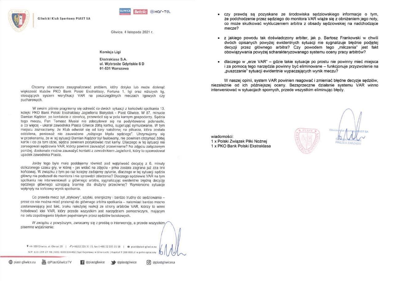 Pismo Gliwickiego Klubu Sportowego "Piast" SA do Komisji Ligi w sprawie systemu wideoweryfikacji VAR podczas meczu 13. kolejki PKO Bank Polski Ekstraklasy Jagiellonia Białystok - Piast Gliwice.