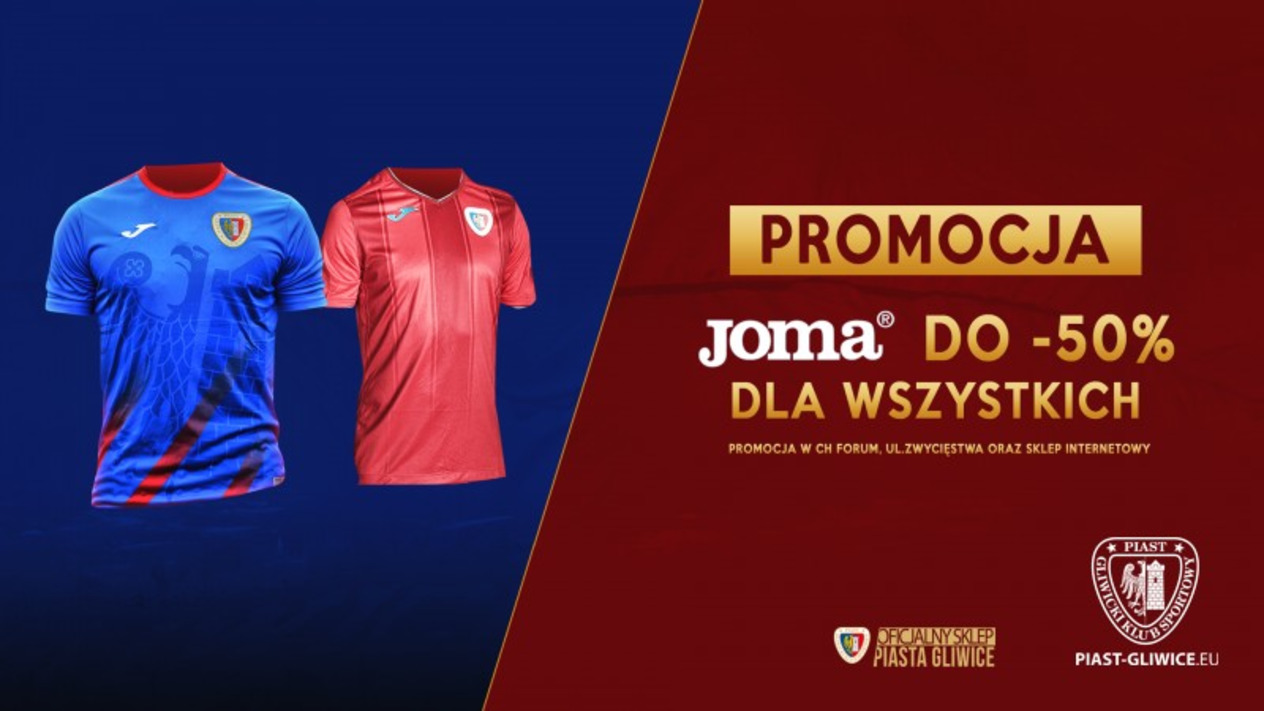 W oficjalnym sklepie Piasta Gliwice trwa kolejny etap promocji na zakup produktów firmy Joma! Wszyscy kibice będą mogli kupić gadżety nawet do 50% taniej!
