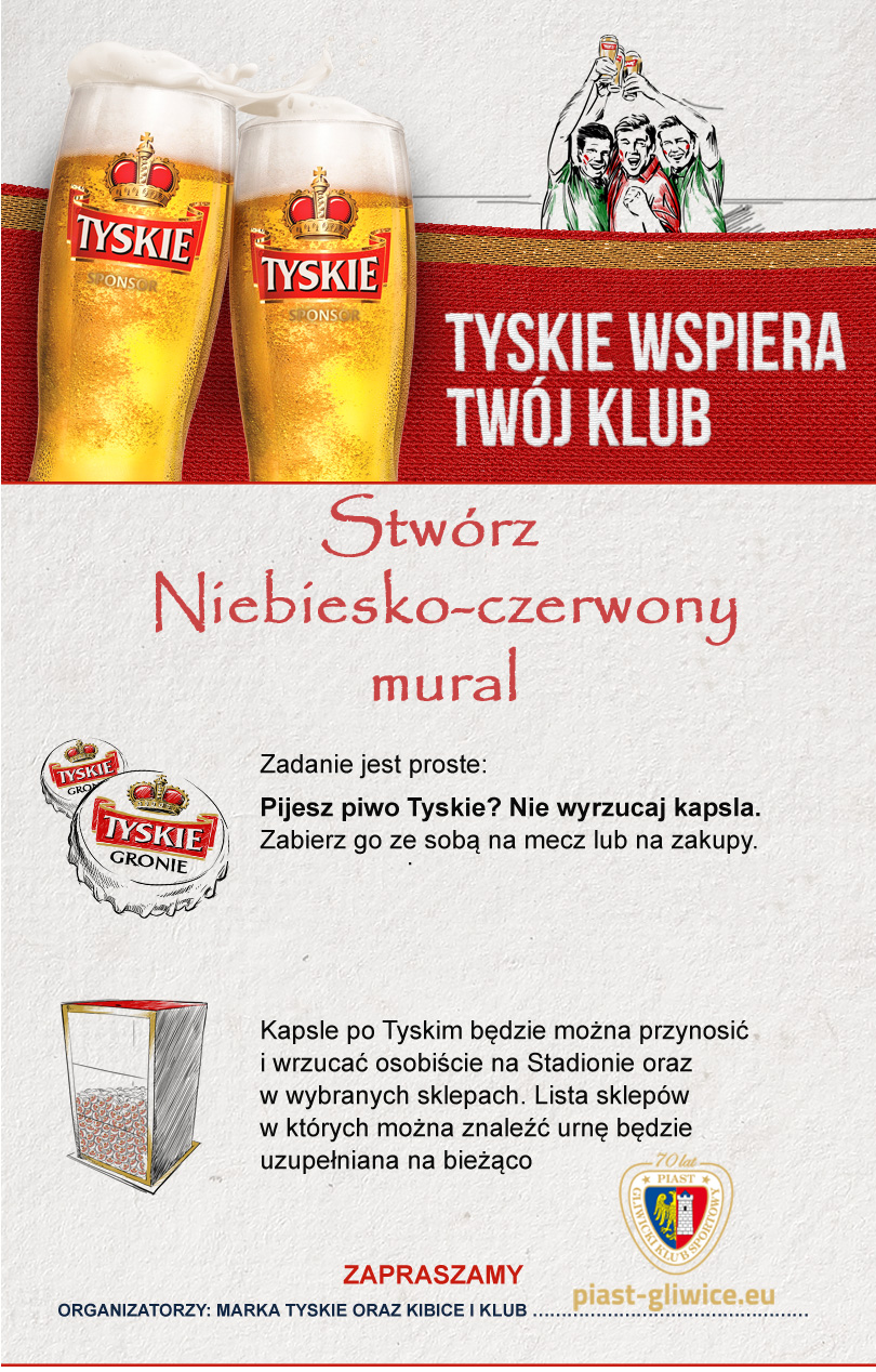 Od sierpnia do października 2015 roku przy wejściu na młyn stanie urna Tyskiego. Każdy będzie mógł wrzucić do niej kapsel po piwie Tyskie. Jeżeli kibice Piasta wypełnią urnę, marka Tyskie przekaże kwotę niezbędną do stworzenia muralu.